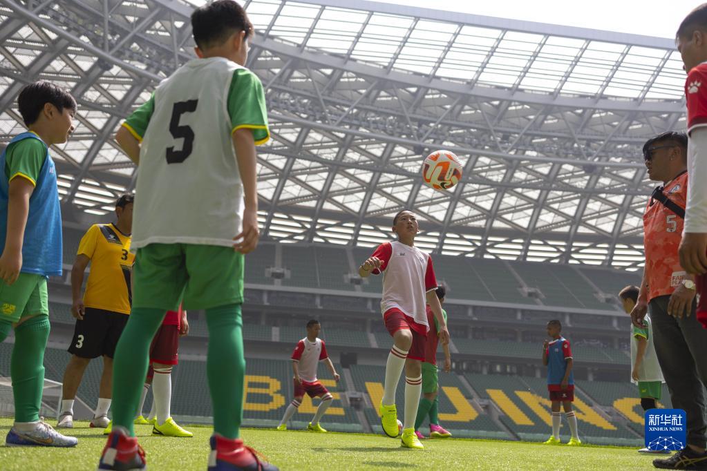 6月1日,在北京工人體育場,藏族孩子與國安少年足球隊隊員訓練交流。