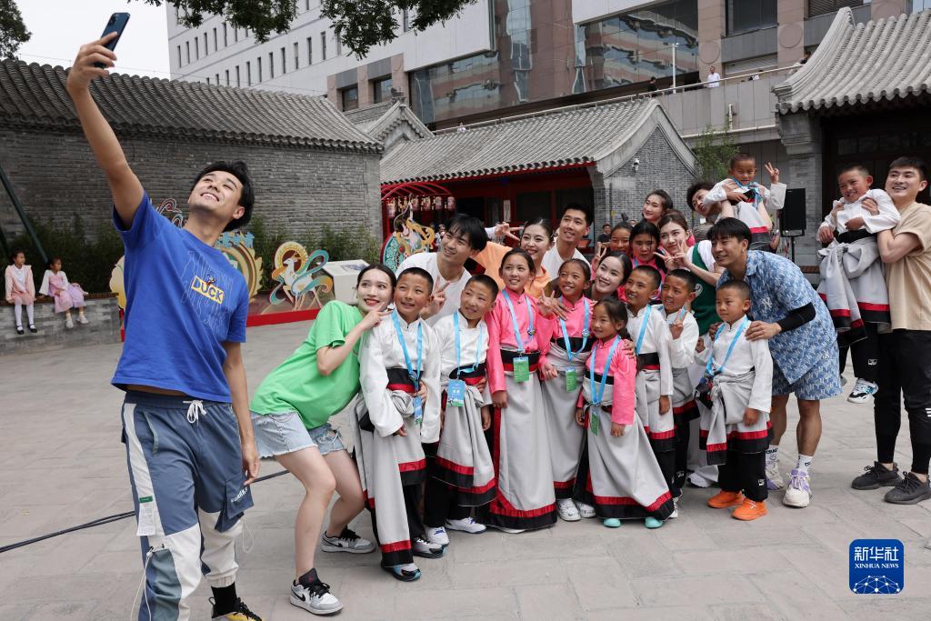 6月1日,來自玉樹州的孩子們在北京蒙藏學校舊址和中央民族歌舞團的演員合影。