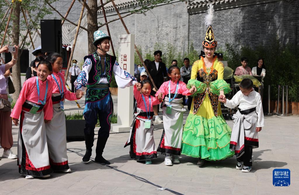 6月1日,來自玉樹州的孩子們在北京蒙藏學校舊址和中央民族歌舞團的演員互動。
