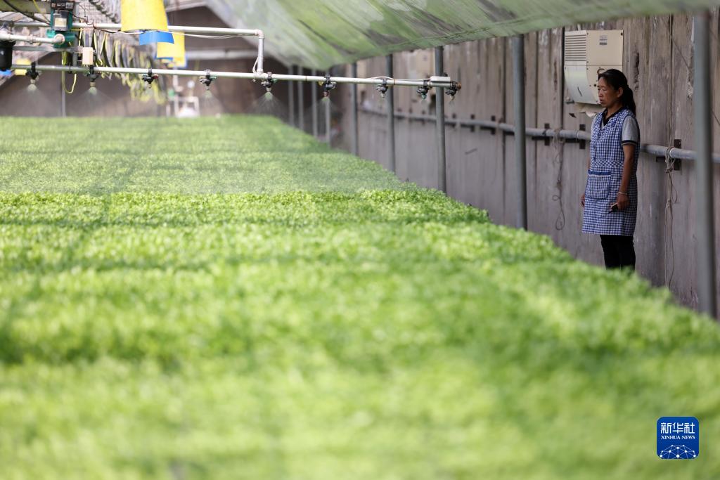 6月1日,在石家莊藁城區河北勤盛種苗科技有限公司育苗溫室,工作人員操控自動化噴淋設備為西芹種苗澆水。