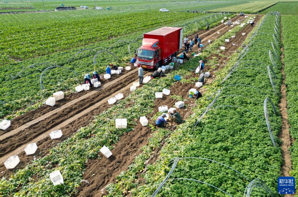 6月1日,農民在河北省玉田縣玉田鎮一處供京蔬菜基地內收獲馬鈴薯(無人機照片)。