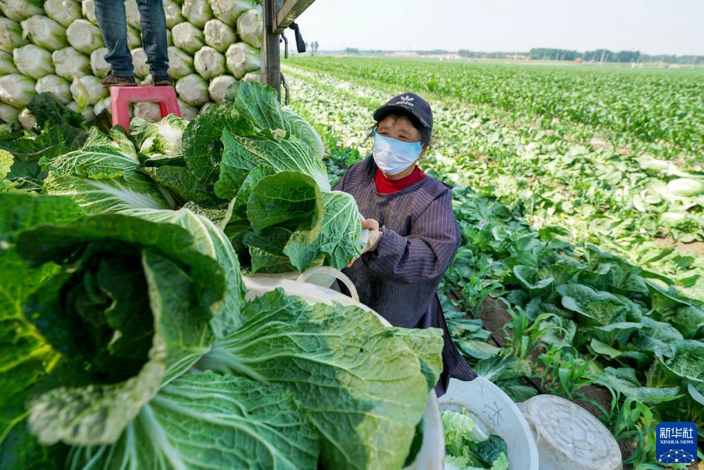 6月1日,農民在河北省玉田縣亮甲店鎮一處供京蔬菜基地內整理收獲的白菜。