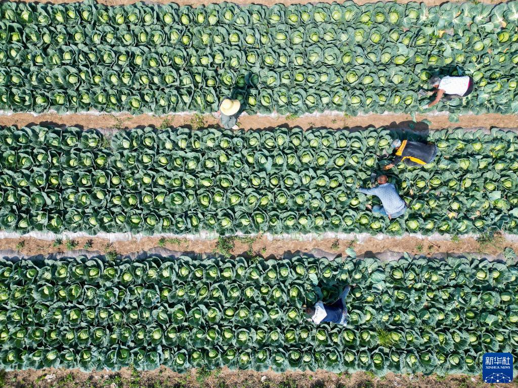 6月1日,農民在河北省玉田縣虹橋鎮一處供京蔬菜基地內收獲甘藍(無人機照片)。