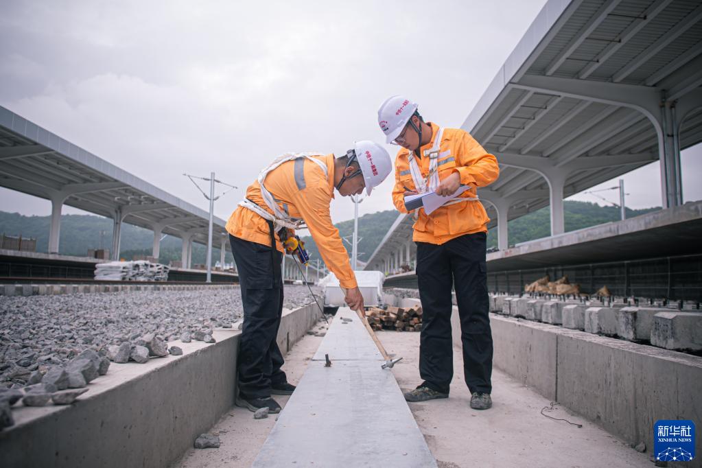 6月1日,寧波工務段金甬鐵路提前介入組的工人對建設中的嵊州站車站附屬設施進行檢測。