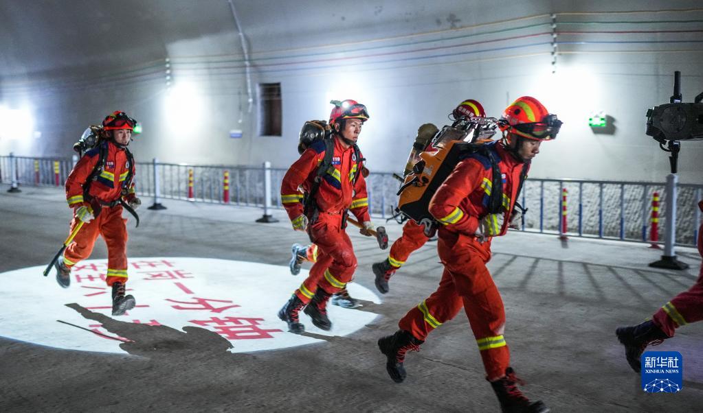 6月1日,工作人員在應急演練中趕赴模擬坍塌現場。
