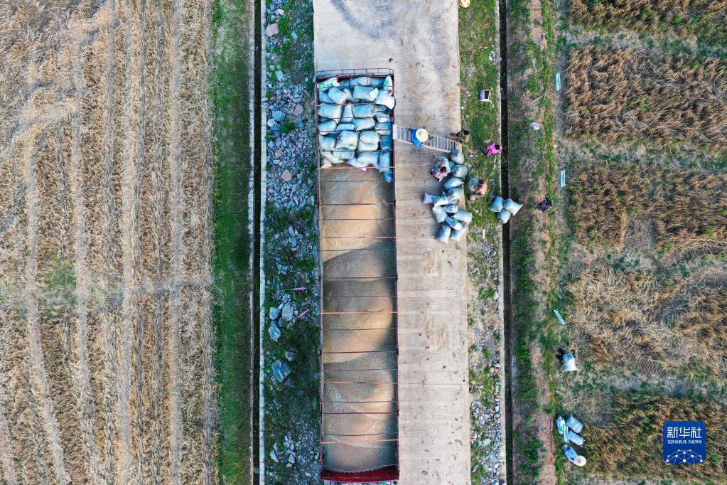 5月31日,在貴州省貴陽市開陽縣宅吉鄉堰塘村,農民將收割的小麥裝車(無人機照片)。