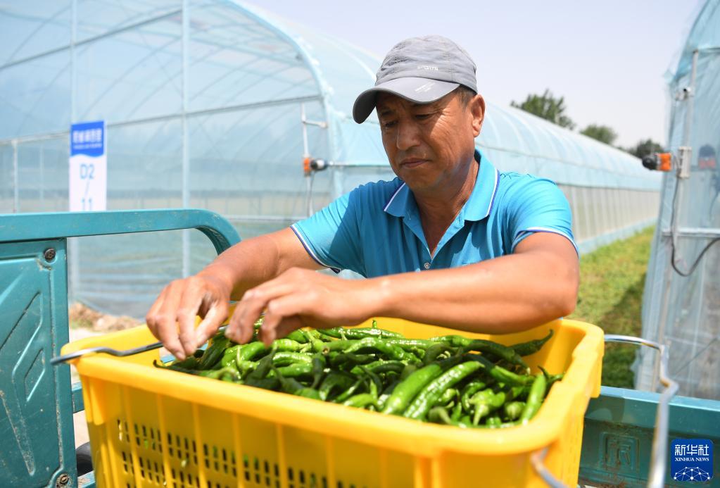 6月1日,河北雄安新區安新縣陽雀湖西里現代農業產業園區工人在整理采摘的辣椒。