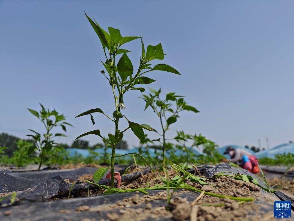 6月1日,河北雄安新區安新縣陽雀湖西里現代農業產業園區工人在管護辣椒秧苗。