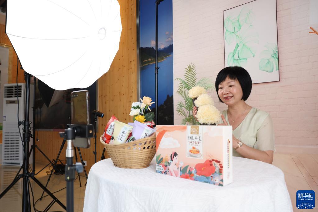 6月1日,福建古田晟農無公害銀耳基地負責人張家巧在直播銷售銀耳產品。