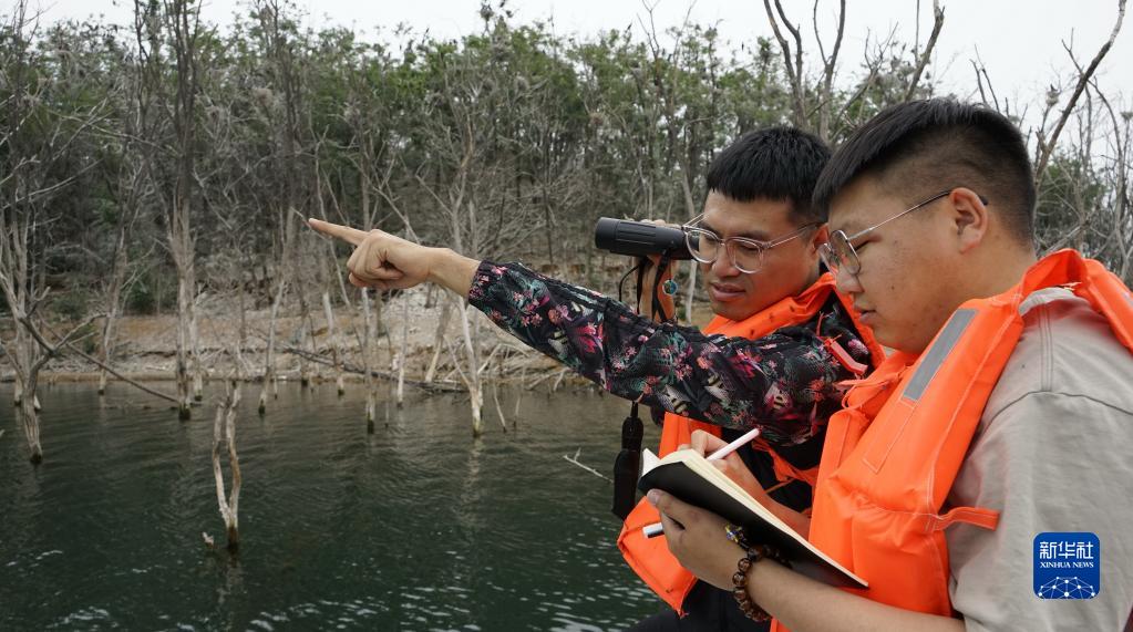 北京市水務局密云水庫管理處水生態管護員在觀察和記錄候鳥育雛情況(5月31日攝)。
