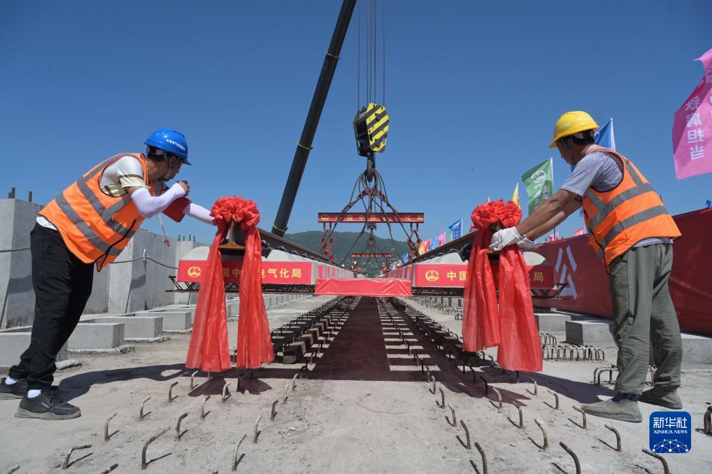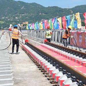 6月1日,中國中鐵電氣化局施工人員在福州濱??炀€首占西高架鋪設軌排。