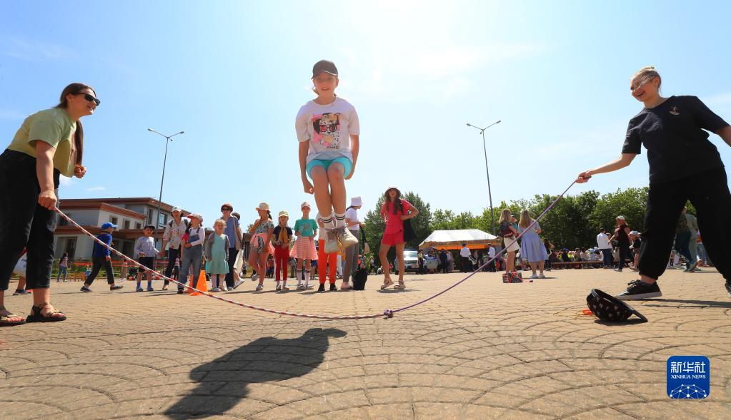 6月1日,孩子們在白俄羅斯首都明斯克做游戲,慶?!傲弧眹H兒童節。