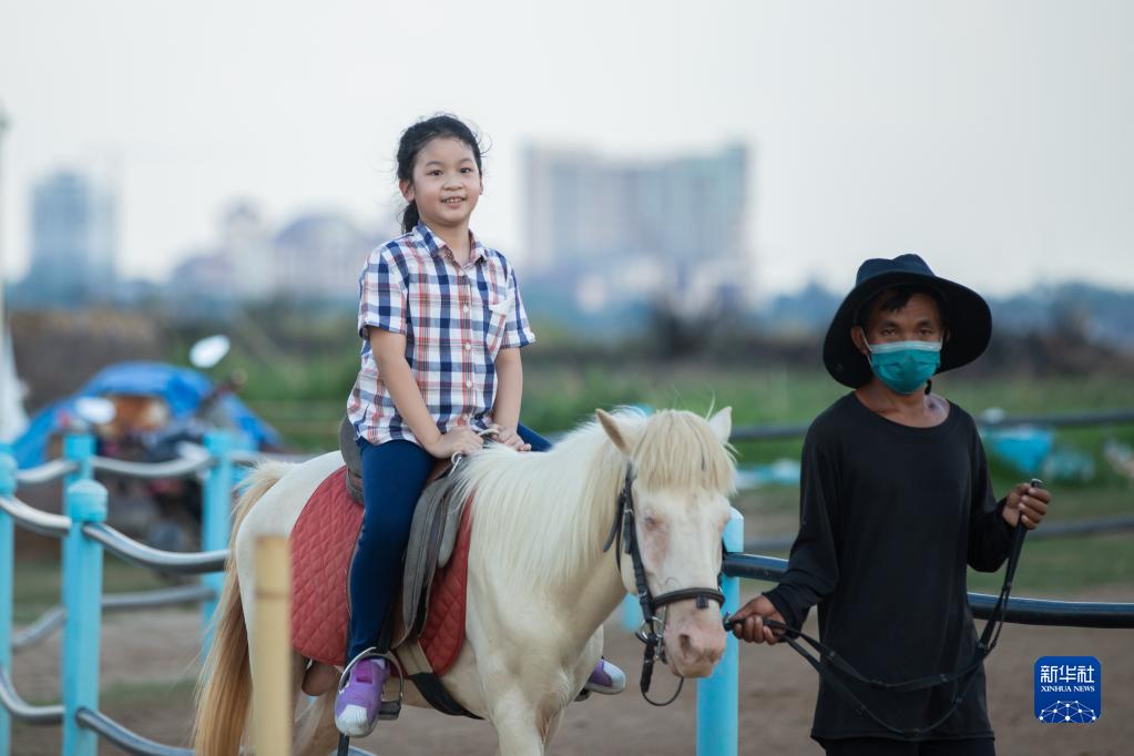 6月1日,一名兒童在老撾首都萬象湄公河邊學騎馬,慶?!傲弧眹H兒童節。
