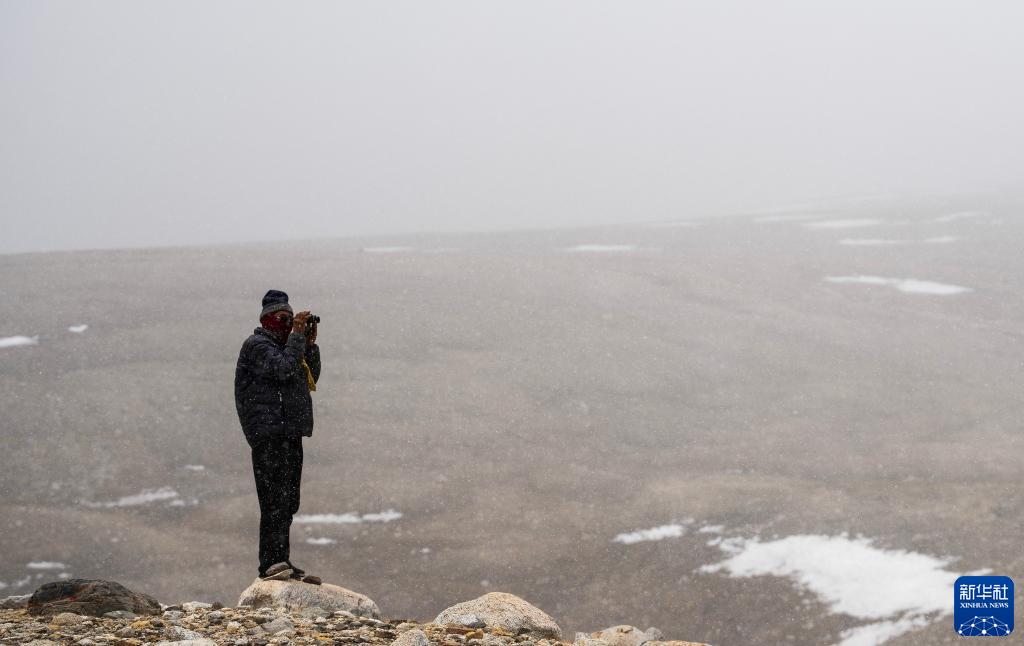 5月31日,乃乃老人用望遠鏡觀察遠處的杰瑪央宗冰川。新華社記者 費茂華 攝