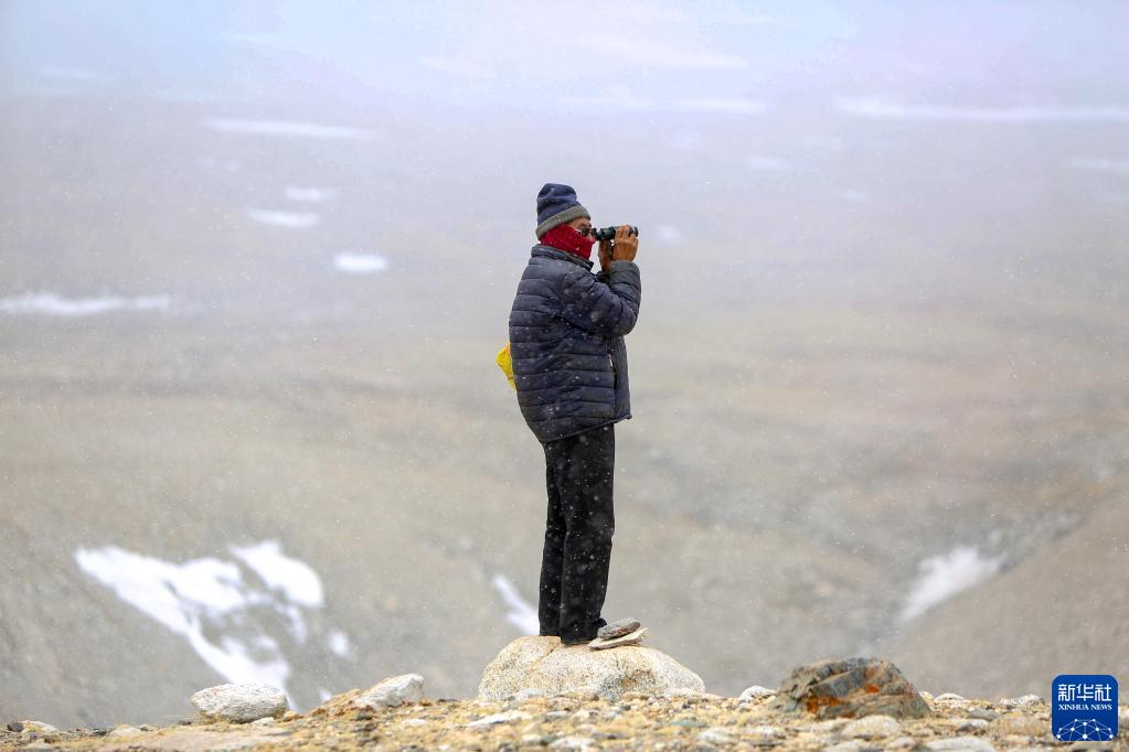 5月31日,乃乃老人用望遠鏡觀察遠處的杰瑪央宗冰川。新華社記者 邵澤東 攝