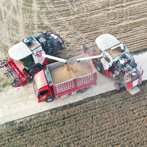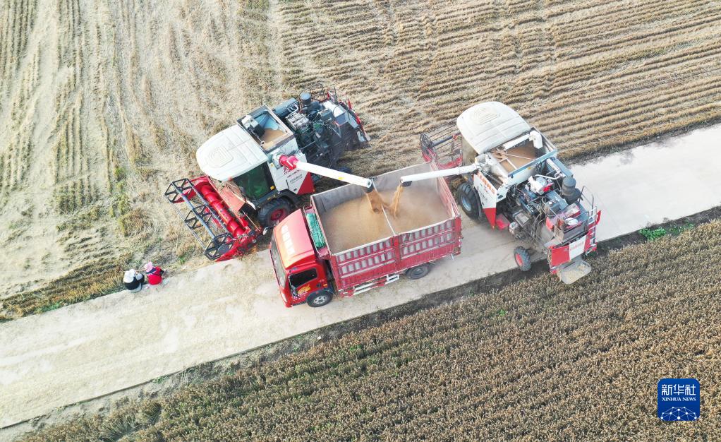 6月1日,在河南省駐馬店市上蔡縣邵店鎮后楊村,收割機將收獲的小麥裝車(無人機照片)。