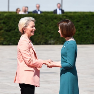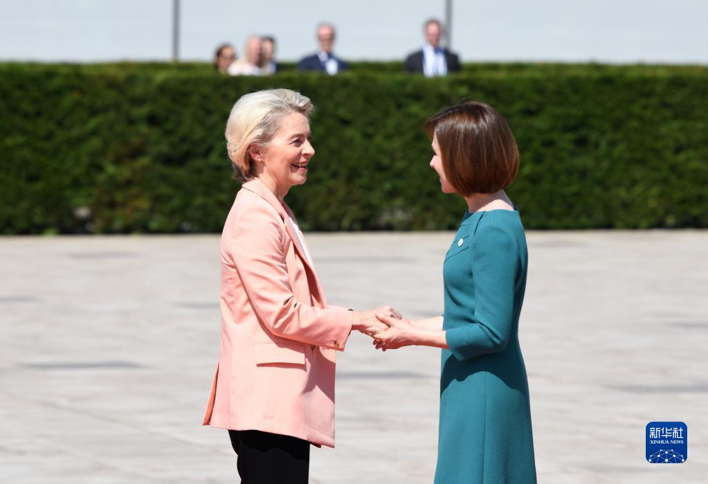 6月1日,在摩爾多瓦布爾博阿克,摩爾多瓦總統桑杜(右)歡迎前來參加第二屆歐洲政治共同體領導人會議的歐盟委員會主席馮德萊恩。