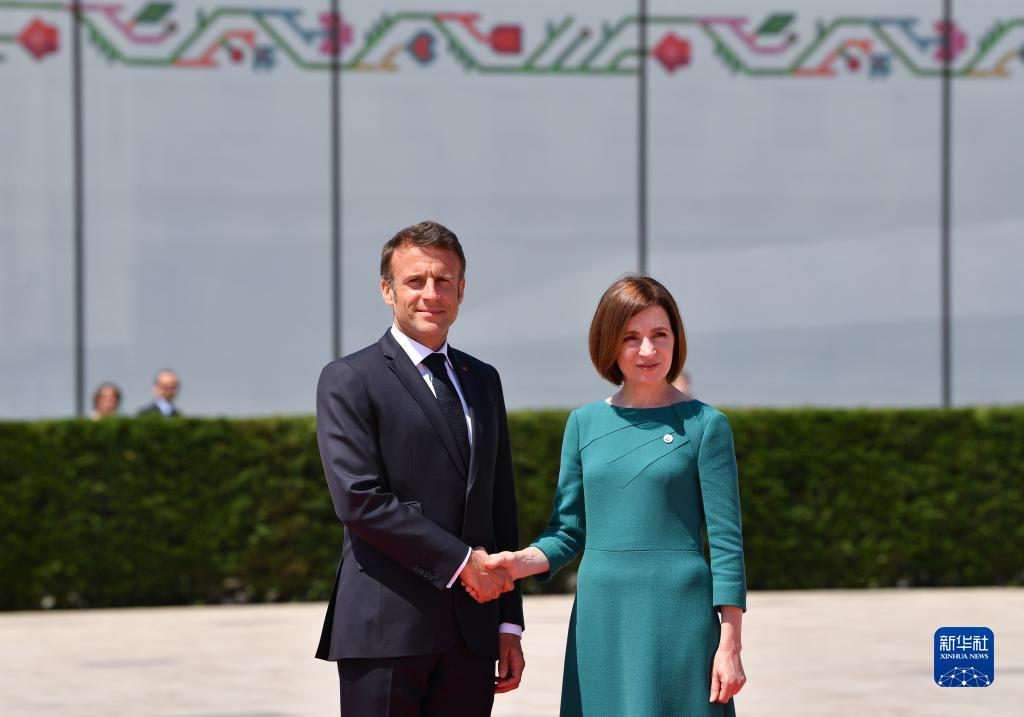 6月1日,在摩爾多瓦布爾博阿克,摩爾多瓦總統桑杜(右)歡迎前來參加第二屆歐洲政治共同體領導人會議的法國總統馬克龍。