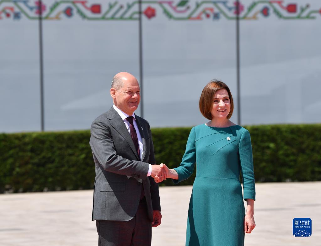 6月1日,在摩爾多瓦布爾博阿克,摩爾多瓦總統桑杜(右)歡迎前來參加第二屆歐洲政治共同體領導人會議的德國總理朔爾茨。