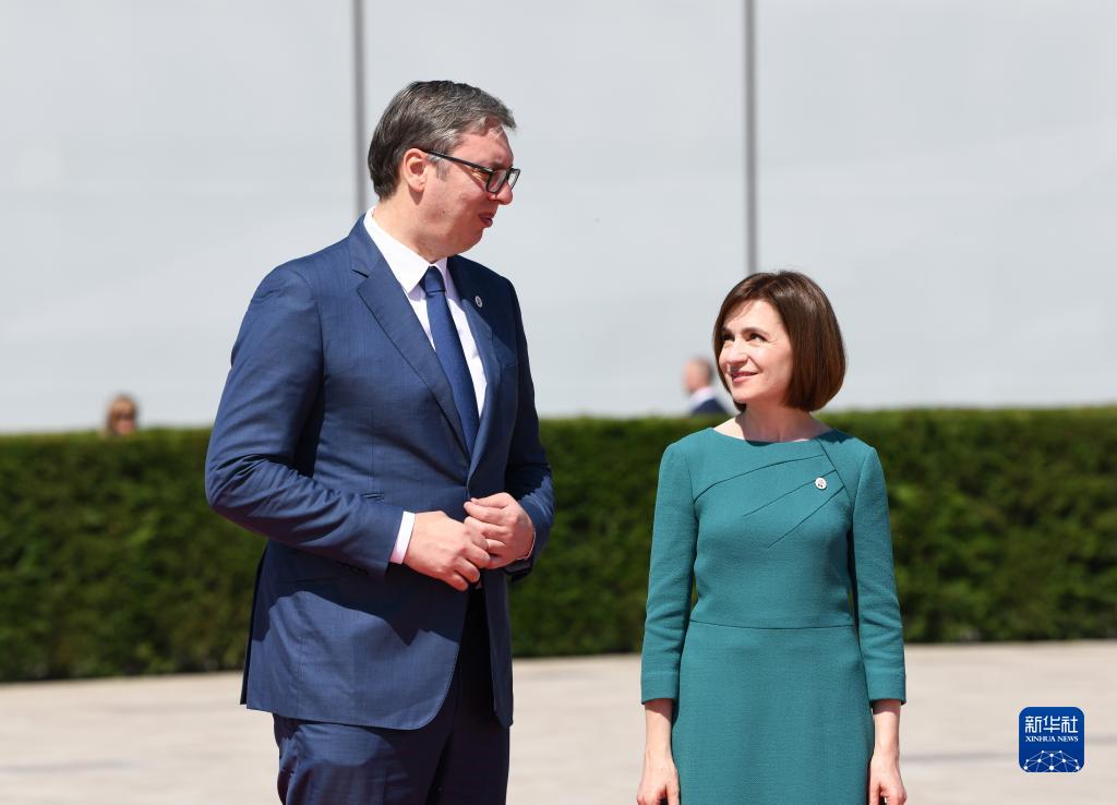 6月1日,在摩爾多瓦布爾博阿克,摩爾多瓦總統桑杜(右)歡迎前來參加第二屆歐洲政治共同體領導人會議的塞爾維亞總統亞歷山大·武契奇。