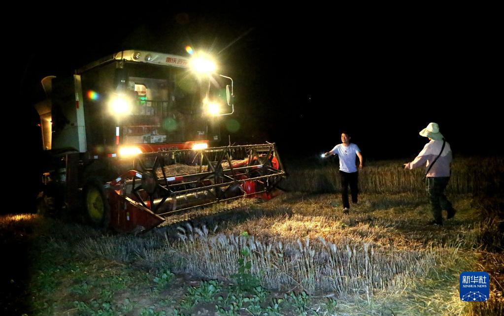 5月31日晚上,河南省洛陽市汝陽縣蔡店鄉蔡店村組織收割機在搶收小麥。