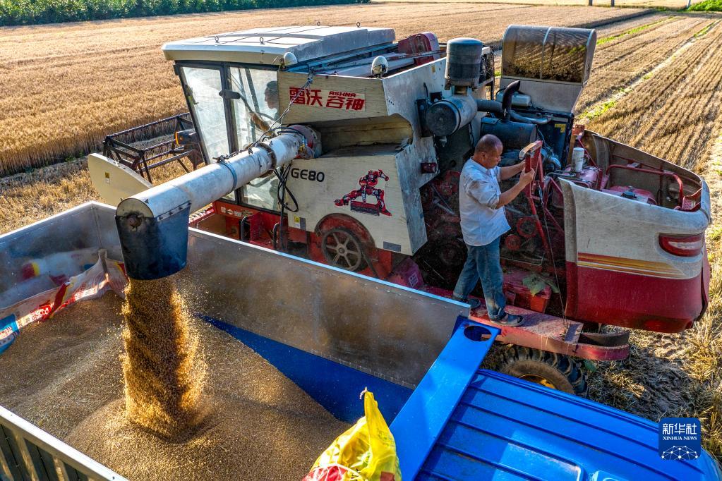 6月1日,在河南省三門峽市靈寶市西閻鄉西呂店村的麥田里,農機手操作大型收割機將小麥裝車(無人機照片)。