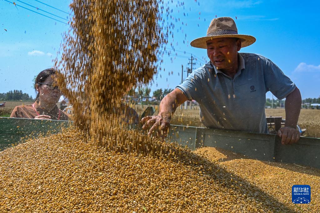 6月1日,河南省漯河市源匯區問十鄉農民從收割機上卸下剛收獲的麥粒。