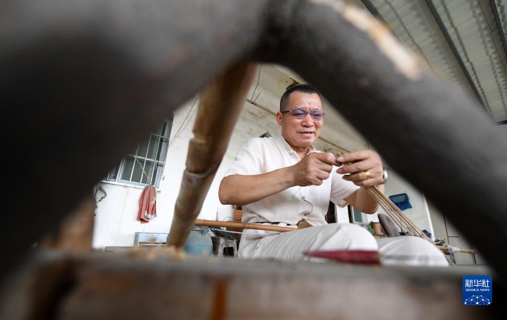 6月1日,在廣西賓陽縣賓州鎮陸村,陸云崗在制作油紙傘。