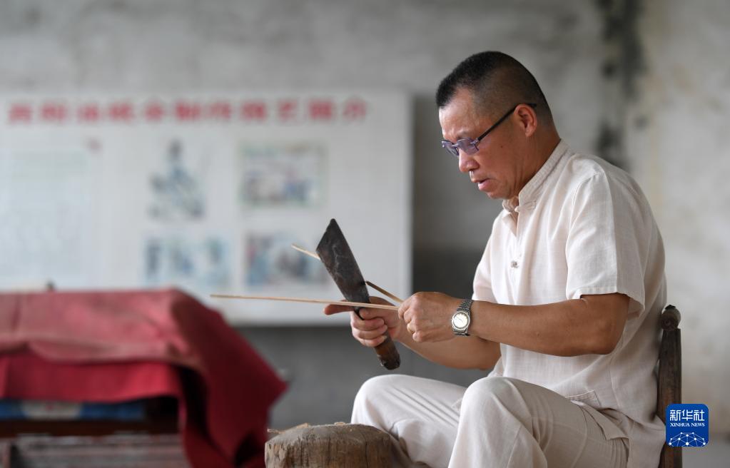 6月1日,在廣西賓陽縣賓州鎮陸村,陸云崗在剖竹篾準備制作油紙傘。