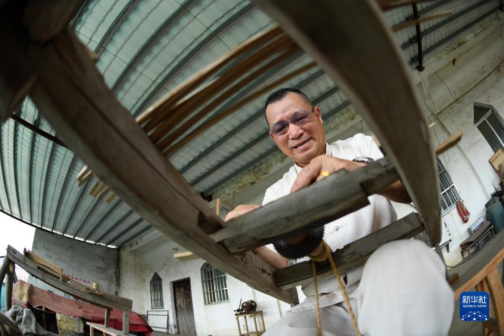 6月1日,在廣西賓陽縣賓州鎮陸村,陸云崗在給竹篾開槽準備制作油紙傘。