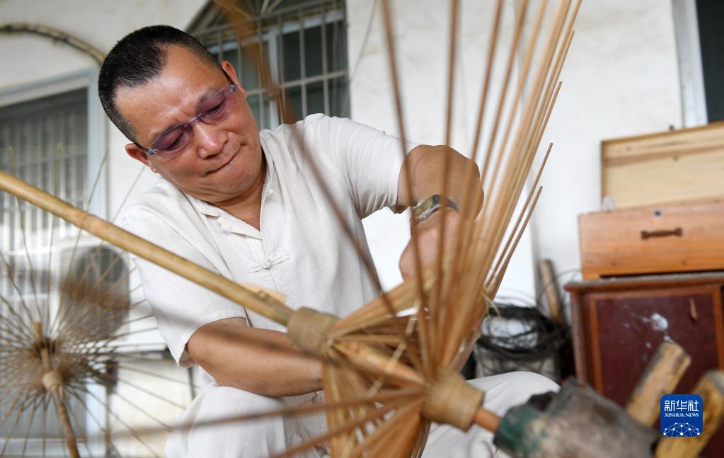 6月1日,在廣西賓陽縣賓州鎮陸村,陸云崗在制作油紙傘。