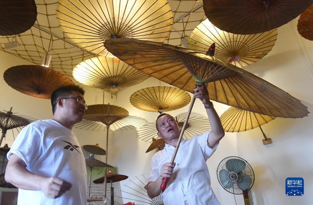 6月1日,在廣西賓陽縣賓州鎮陸村,陸云崗(右)在介紹油紙傘制作技藝。