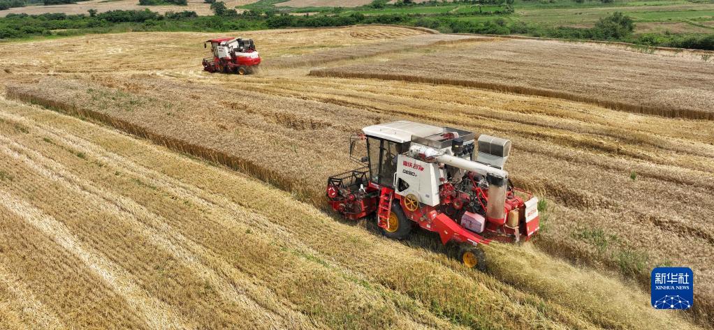 “三夏”時節,在合肥市蜀山區小廟鎮,農民操作大型收割機收割小麥,田間地頭一派忙碌景象。
