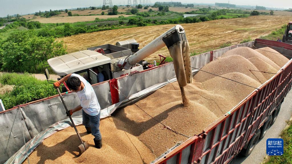 6月2日,在合肥市蜀山區小廟鎮段沖村,收割機將小麥裝車(無人機照片)。