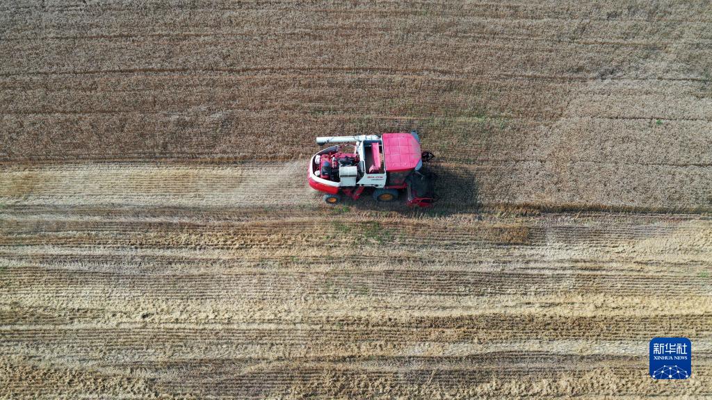 “三夏”時節,在合肥市蜀山區小廟鎮,農民操作大型收割機收割小麥,田間地頭一派忙碌景象。