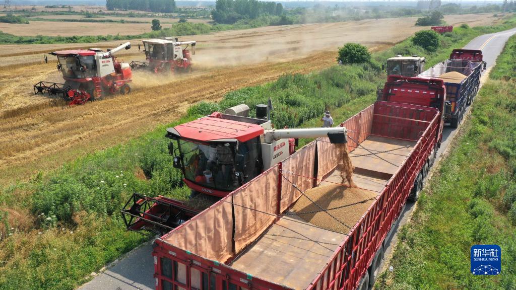“三夏”時節,在合肥市蜀山區小廟鎮,農民操作大型收割機收割小麥,田間地頭一派忙碌景象。