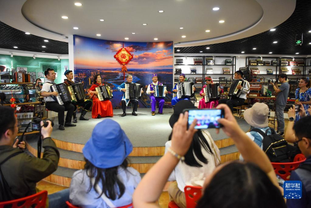 在新疆伊犁哈薩克自治州伊寧市六星街,游客在亞歷山大手風琴珍藏館欣賞多民族手風琴樂隊的表演(5月19日攝)。