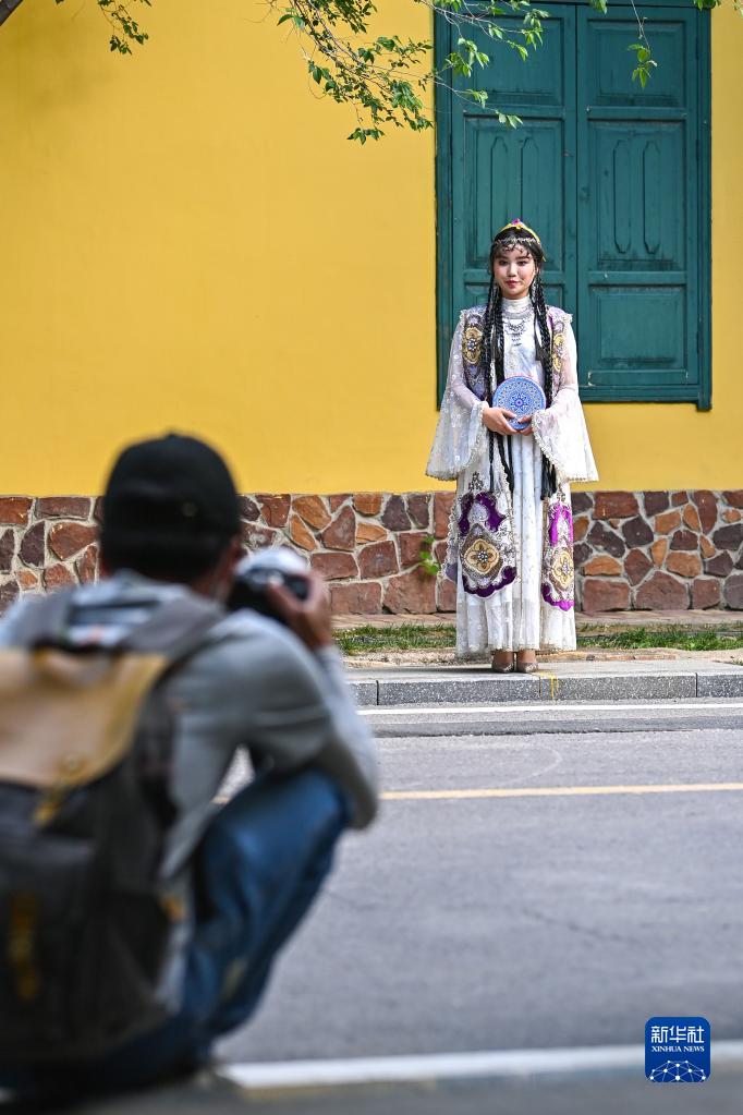 在新疆伊犁哈薩克自治州伊寧市六星街,游客打卡拍照(5月19日攝)。