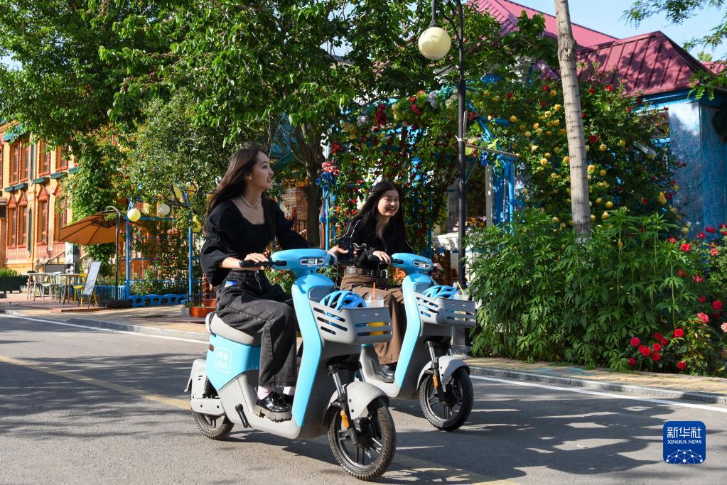 在新疆伊犁哈薩克自治州伊寧市六星街,游客騎著電動車游覽(5月19日攝)。?