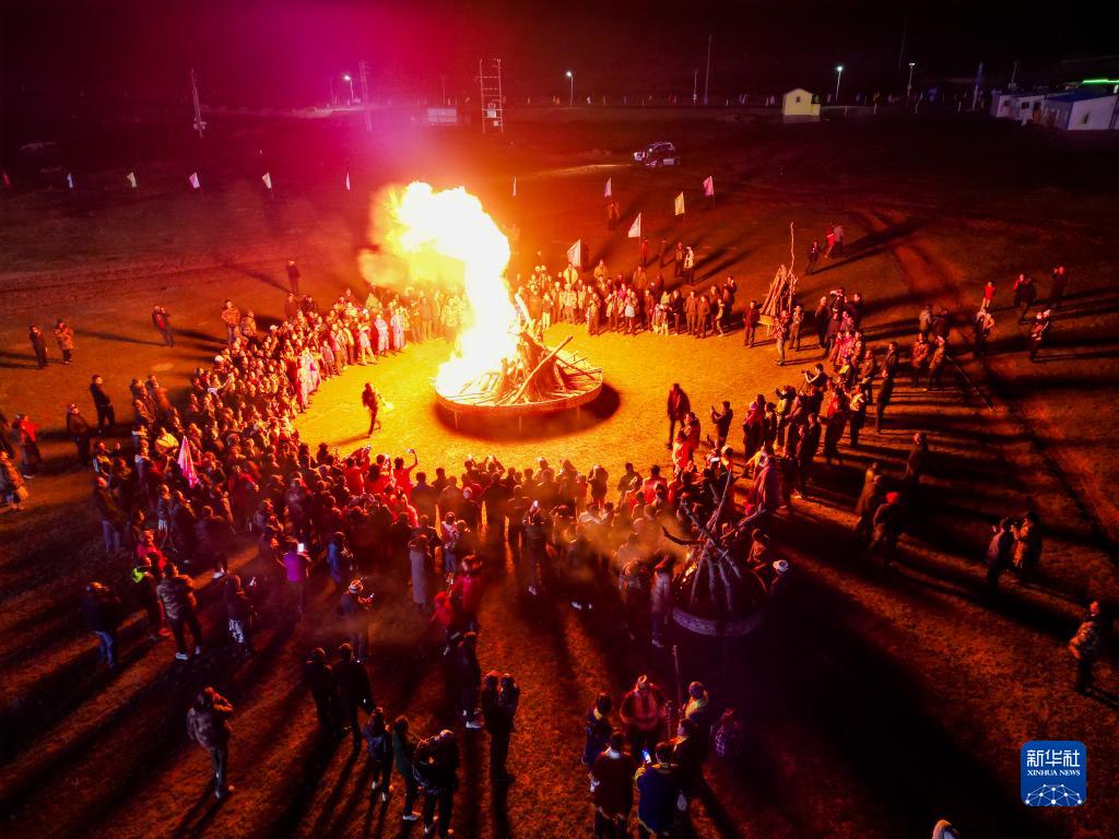 游客在新疆和田策勒縣板蘭格景區舉辦的一場篝火晚會上載歌載舞(5月30日攝,無人機照片)。