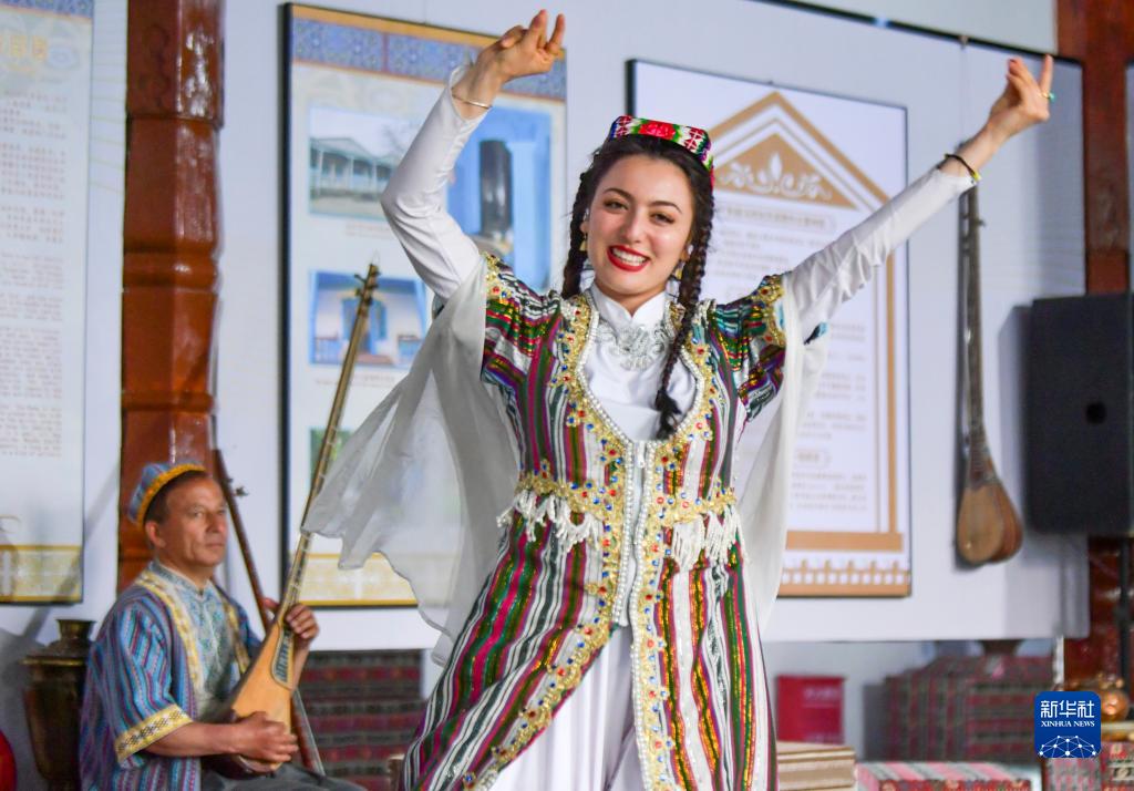演員在新疆伊寧市喀贊其景區為游客表演“埃希來、葉來(一種烏茲別克族的民間傳統樂舞)”(5月18日攝)。