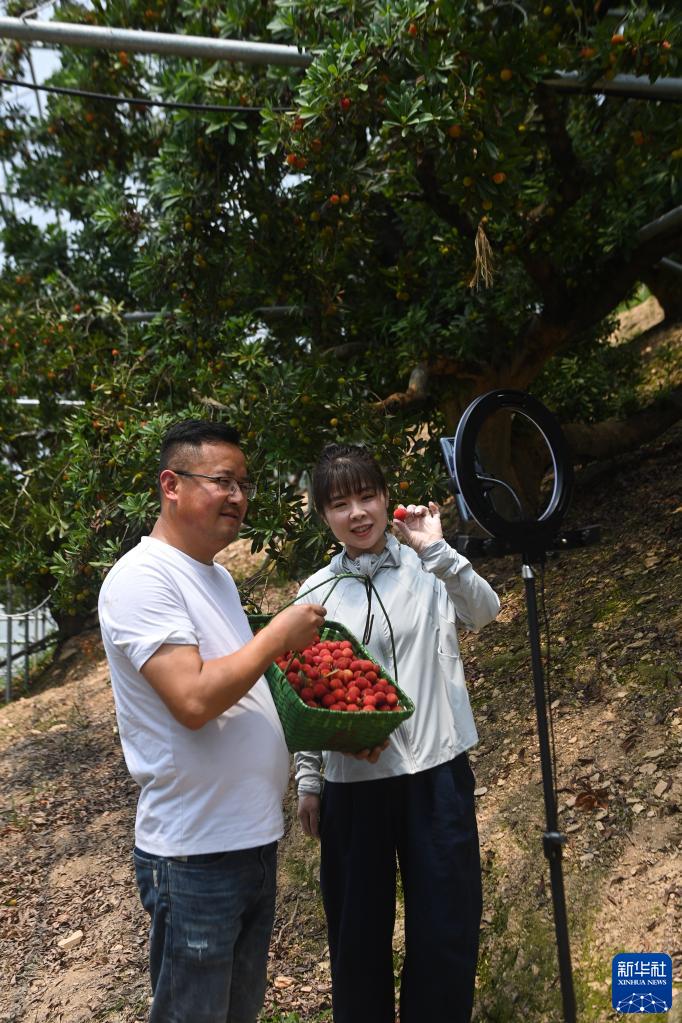 6月2日,蔥坑村返鄉青年人才林靈(左)和妻子一起在楊梅林里直播售賣楊梅。
