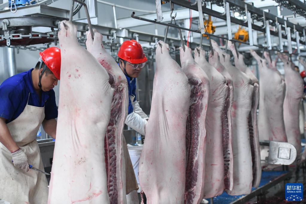 在黑龍江省鐵力市的18萬頭生豬屠宰項目生產線上,工作人員在作業(6月1日攝)。