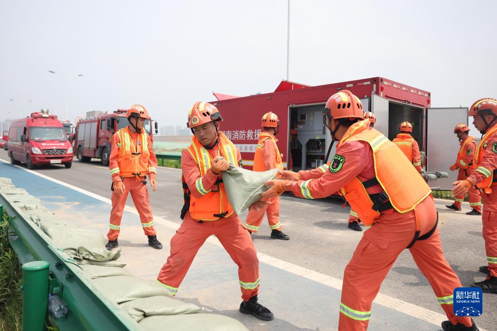 6月2日,在水域救援實戰演習現場,消防救援人員在模擬砂石打包固堤。