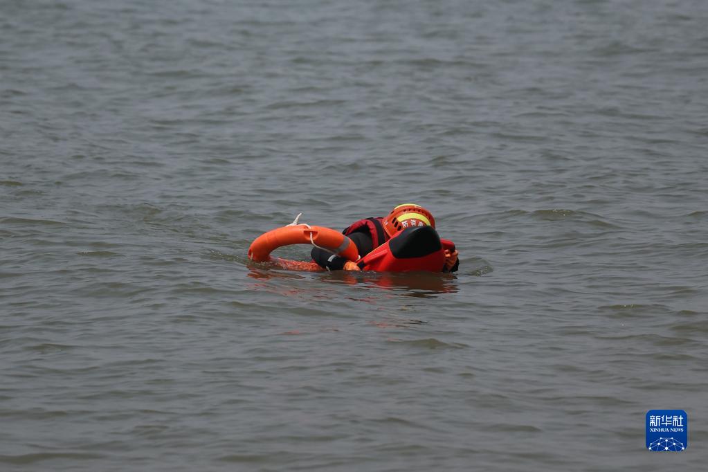 6月2日,在水域救援實戰演習現場,一名模擬被困人員依靠智能水上救生遙控機器人回到岸邊。