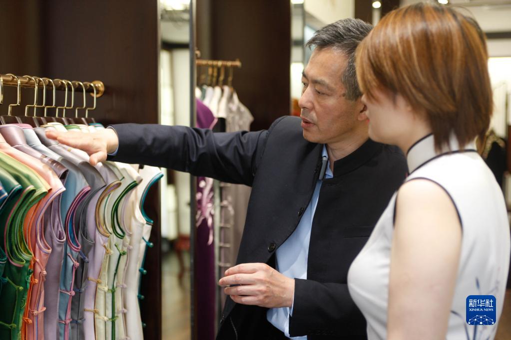 5月30日,江滿宗(左)在上海市“龍鳳旗袍”門店為顧客挑選旗袍。