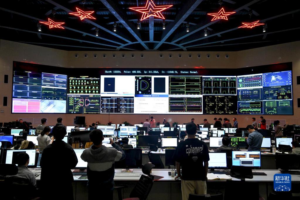 這是實驗成功后的全超導托卡馬克核聚變實驗裝置(EAST)控制大廳(2023年4月12日攝)。4月12日21時,中國有“人造太陽”之稱的全超導托卡馬克核聚變實驗裝置(EAST)創造新的世界紀錄,成功實現穩態高約束模式等離子體運行403秒。