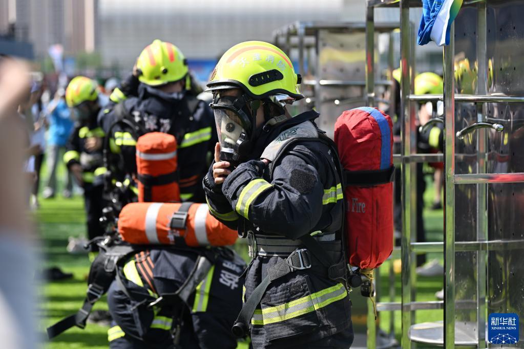 6月2日,微型消防站代表參加原地著裝加佩戴空氣呼吸器消防業務技能比武。