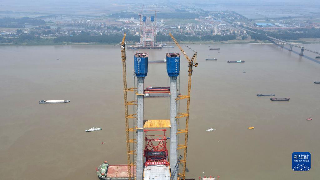 6月2日拍攝的封頂后的京臺高速銅陵長江公鐵大橋4號主塔(無人機照片)。