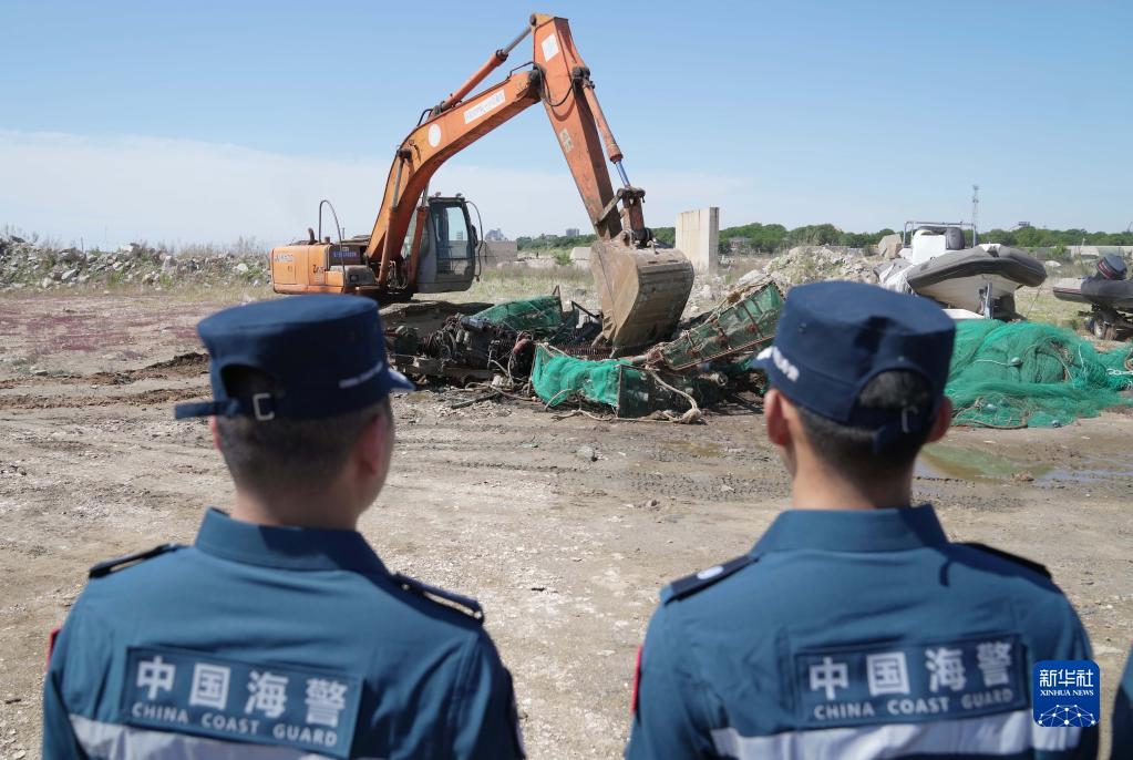 6月2日,工作人員在現場銷毀非法捕撈工具。
